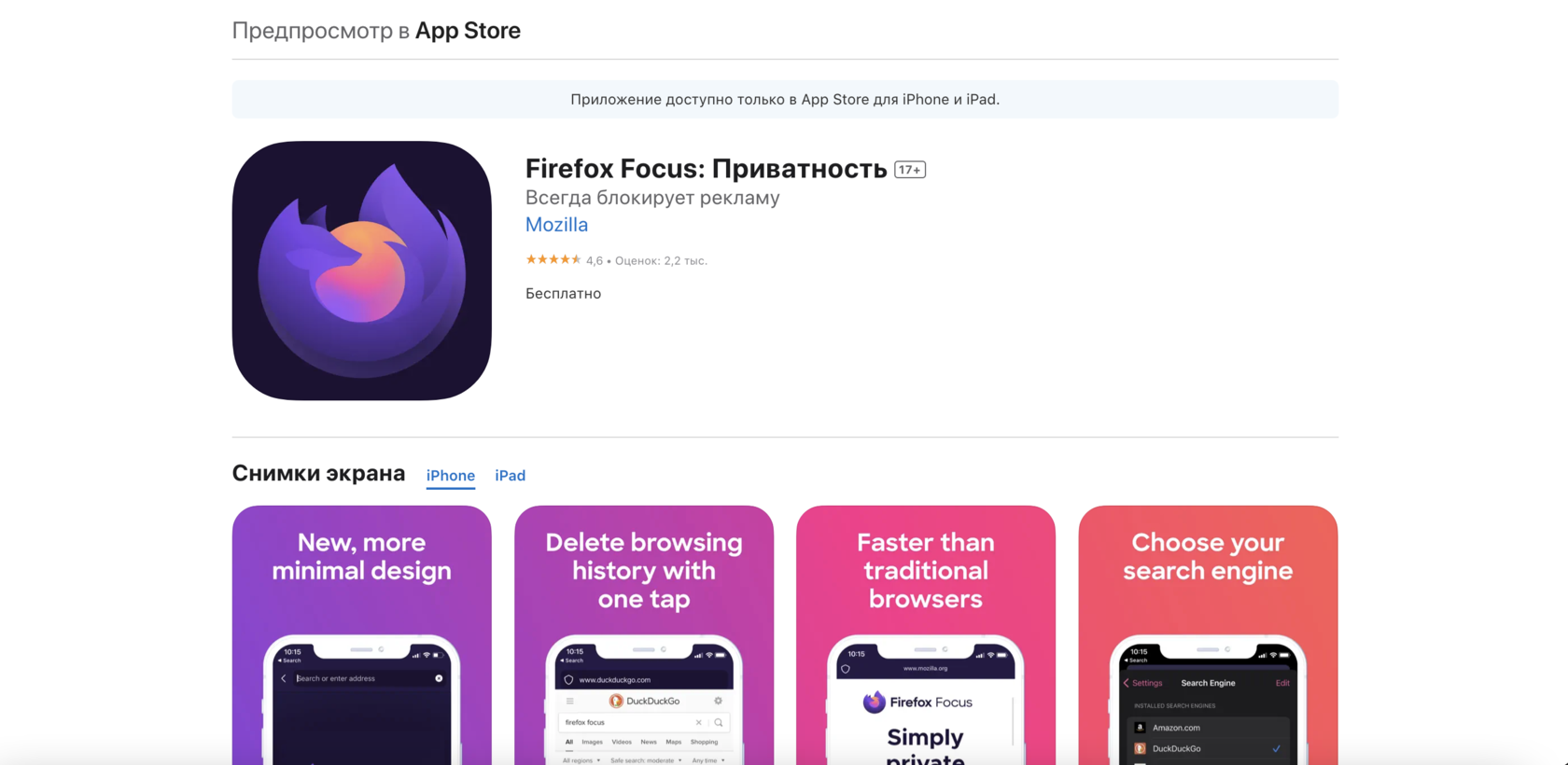 3. Firefox Focus is the official browser from Mozilla Firefox. It is available on both iOS and Android.