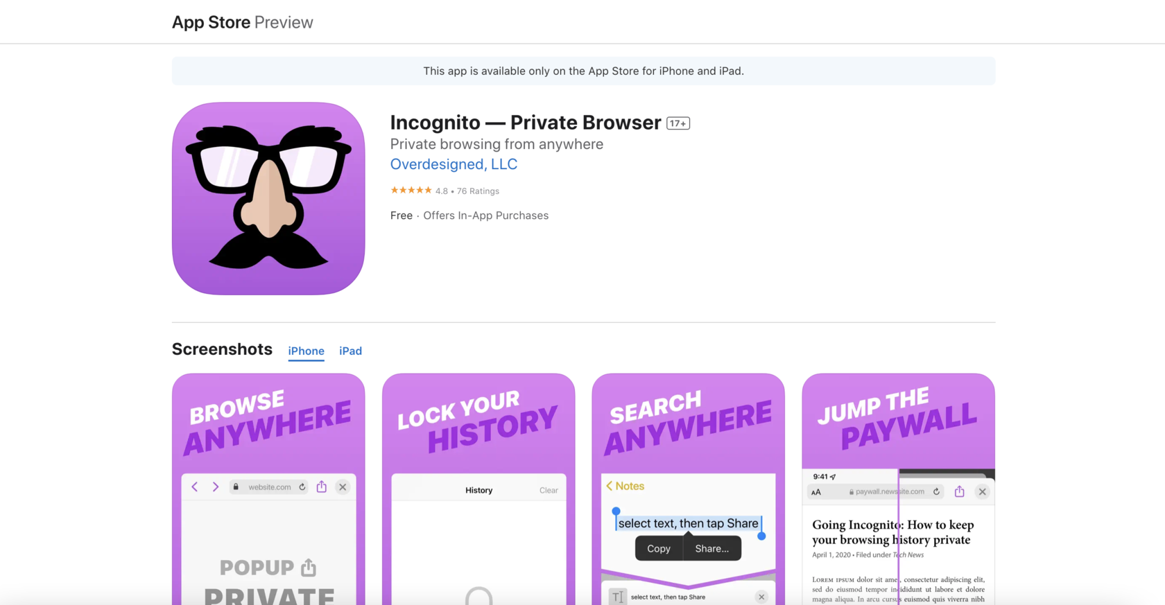 5. Incognito Private Browser is an anti-detect browser on iOS with a very good rating on the App Store - 4.7